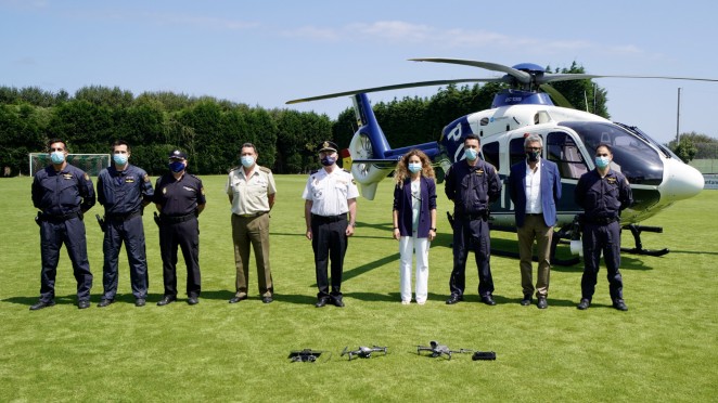 Las fotografías y el vídeo superior corresponden a la presentación del dispositivo de refuerzo de vigilancia del Cuerpo Nacional de Policía formado por un helicóptero y dos drones.